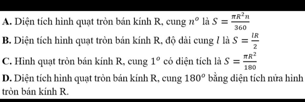 Đáp án: C .Diện tích hình quạt tròn bán kính R , cung 1 độ có diện tích là S = `(πR^2)/180`$\\$ -> Sửa lại : S = `(πR^2)/360`