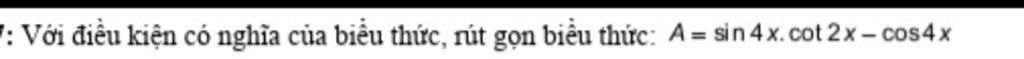 $A=\sin 4x.\cot 2x-\cos 4x\\ =2 \sin 2x \cos 2x.\dfrac{\cos 2x}{\sin 2x}-(2\cos^22x-1)\\ =2 \cos^22x-2\cos^22x+1\\ =1$