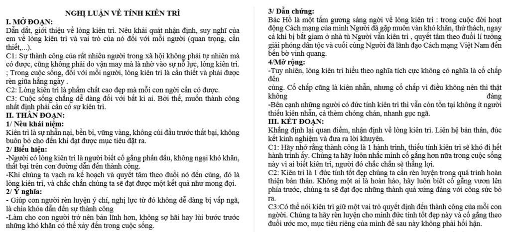 Lòng kiên trì là một đức tính tốt, cần được phát huy, có ý nghĩa lớn quyết định đến cuộc đời của mỗi con người. Khi chúng ta vạch ra kế hoạch và quyết tâm theo đuổi nó đến cùng, đó là lòng kiên trì, và chắc chắn chúng ta sẽ đạt được một kết quả như mong đợi. Có một người bạn có đam mê văn chương, bạn ấy viết rất nhiều, nhưng gia đình lại phản đối và buộc bạn phải lựa chọn con đường đi khác. Bạn vẫn kiên trì với ước mơ đó, theo đuổi nó và bây giờ bạn là một nhà văn trẻ có tên tuổi. Nhờ vào sự kiên trì, quyết tâm theo đuổi đam mê nên bạn đã thành công. Đây chính là bài học mà nhiều người cần phải học hỏi và rèn luyện.