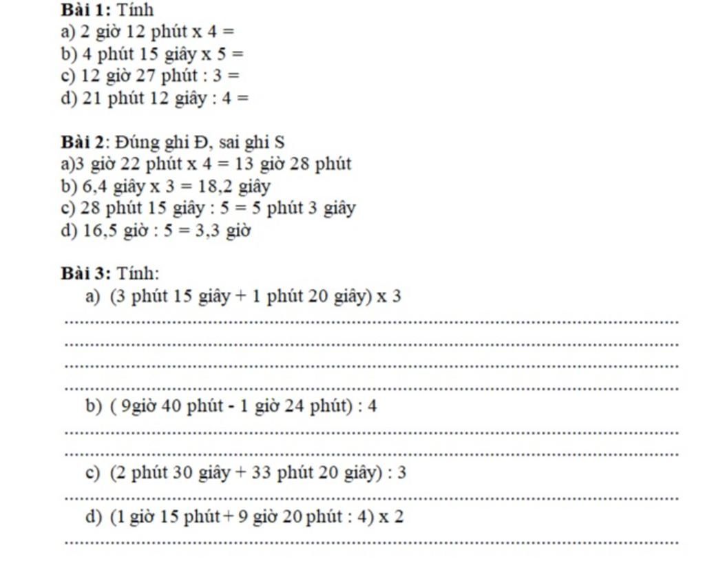 a) ( 3 phút 15 giây + 1 phút 20 giây ) x 3 = 4 phút 35 giây x 3 = 12 phút 105 giây = 13 phút 45 giây