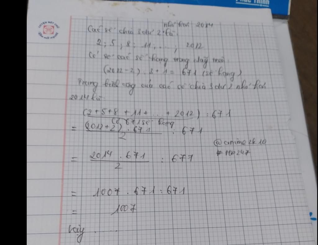 TBC của tất cả các số tự nhiên chia cho 3 dư 2 không vượt quá 2014 là: