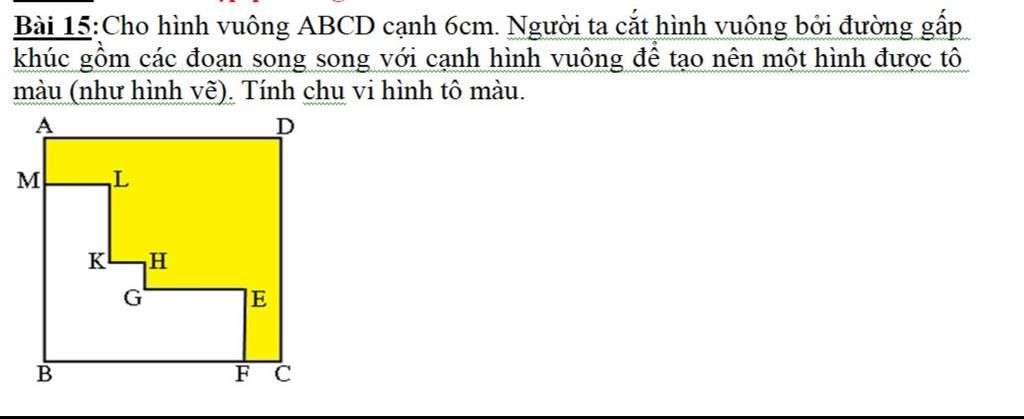 Cho hình vuông ABCD cạnh 6cm. Người ta cắt hình vuông bởi đường gấp khúc gồm các đoạn song song với cạnh hình vuông để tạo nên một hình được tô màu (như hình vẽ). Tính chu vi hình tô màu