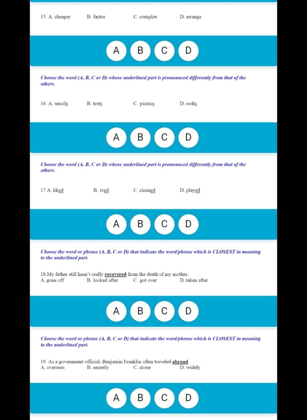 Câu 17: A. Cách phân biệt từ có đuôi ed( ch, x, ph, ss, f, k, th: chiều xuống phong sương phủ kín thành. Những từ này có đuôi ed cuối đọc thành 1 âm)