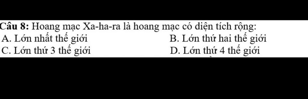Câu 8: Hoang mạc Xa- ha - ra là hoang mạc có diện tích rông:
