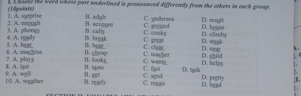 1. Choose the word whose part underlined is pronounced differently from the others in each group.