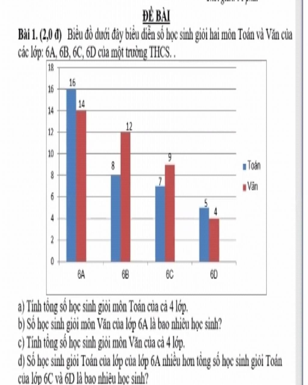 d, Xét biểu đồ ta thấy số học sinh giỏi toán của lớp 6A nhiều hơn tổng số học sinh giỏi toán của lớp 6C và 6D là : 16 - (5 + 7) = 4 ( học sinh giỏi )