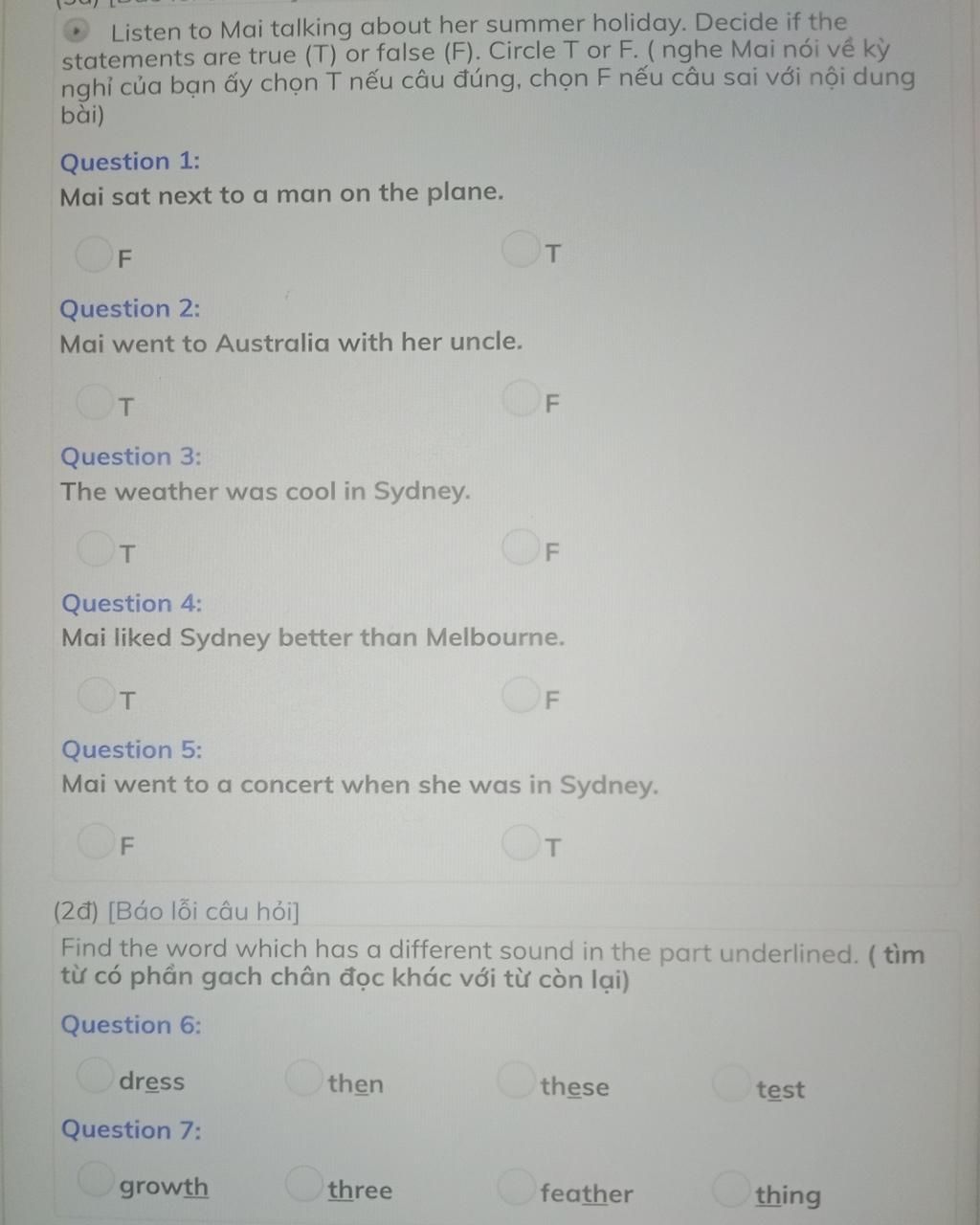 statements are true (T) or false (F). Circle T or F. ( nghe Mai nói về kỳ