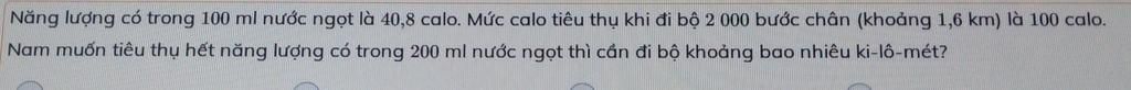 Nam muốn tiêu thụ hết năng lượng có trong 200 ml nước ngọt thì cần đi bộ khoảng bao nhiêu ki-lô-mét?