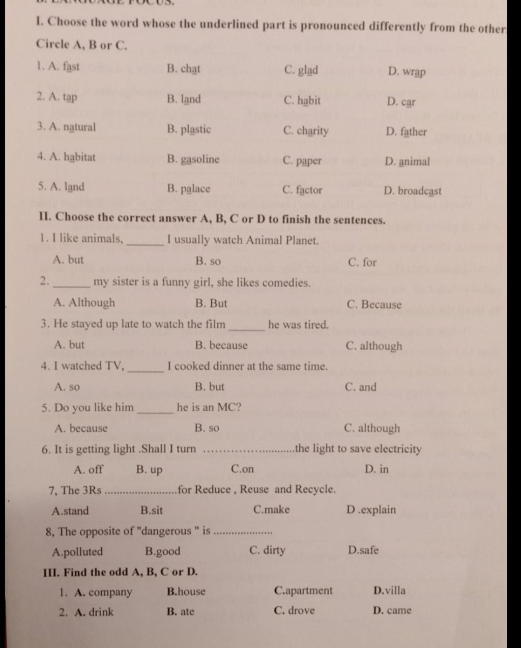 I. Choose the word whose the underlined part is pronounced differently from the other