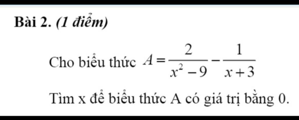 Để `A=0` thì ` 2/((x+3)(x-3)) - (x-3)/((x+3)(x-3)) = 0`