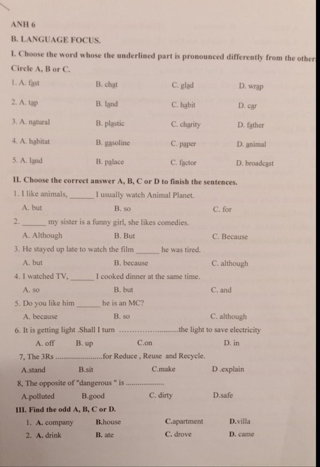 I. Choose the word whose the underlined part is pronounced differently from the others