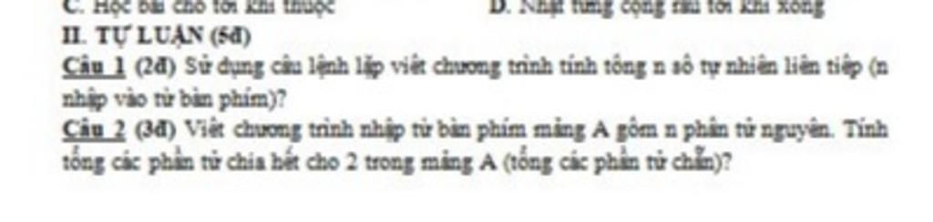 Câu 1 (2đ) Sử đụng câu lệnh lặp viêt chương trình tính tổng m số tự nhiêm liêm tiếp (n