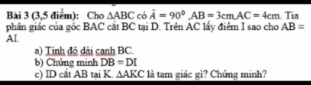 Bài 3 (3,5 điểm): Cho AABC có Â = 90° .AB = 3cm,AC= 4cm. Tia