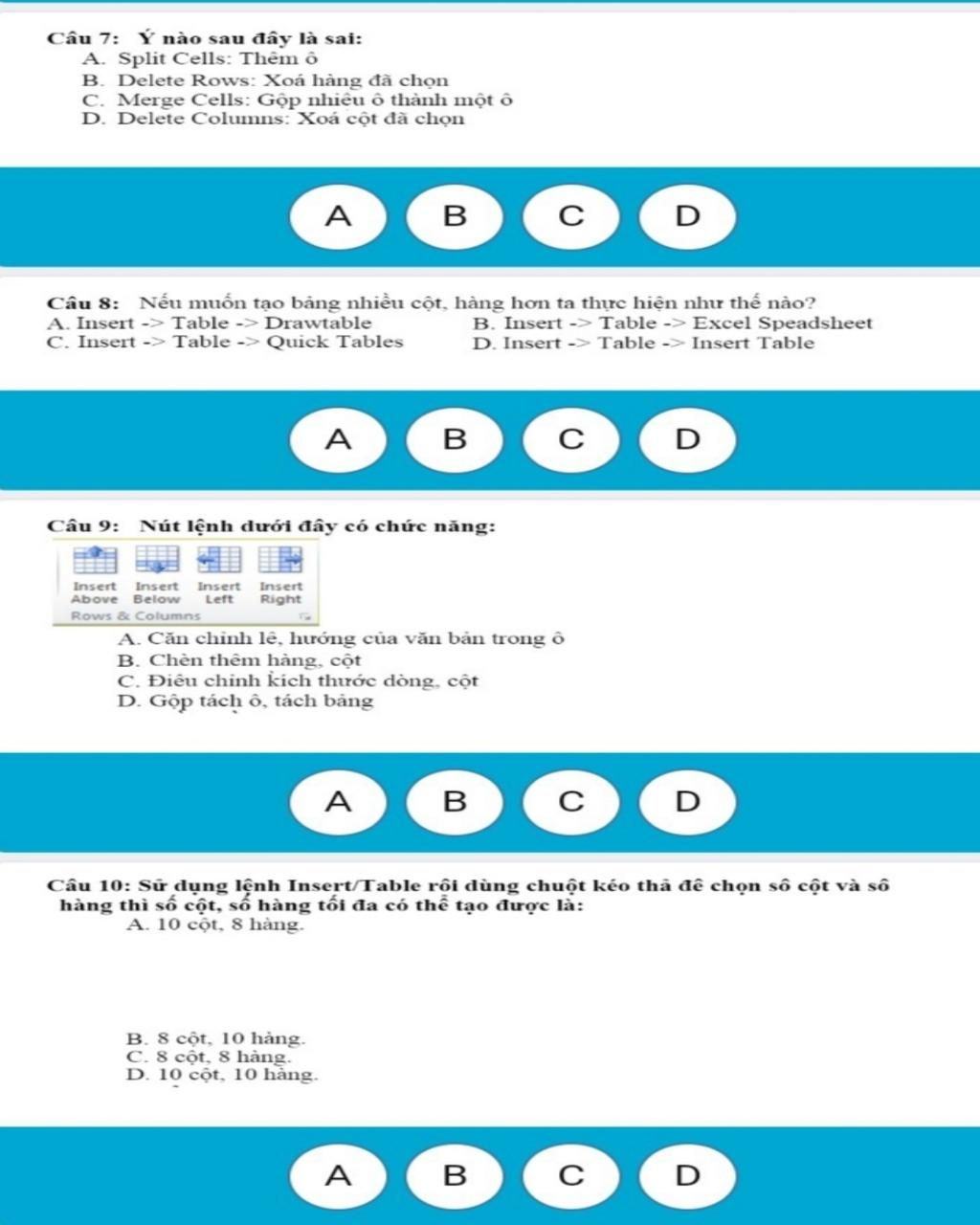 Câu 10: Sử dụng lệnh Insert/Table rồi dùng chuột kéo thả để chọn số cột và số hàng thì số cột, số hàng tối đa có thể tạo được là?