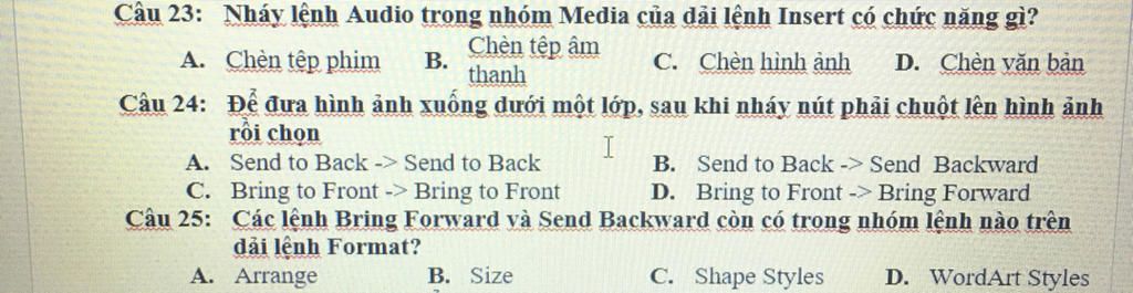 Câu 24: Để đưa hình ảnh xuống dưới một lớp, sau khi nháy nút phải chuột lên hình ảnh,ta chọn Send to Back -> Send to Back.