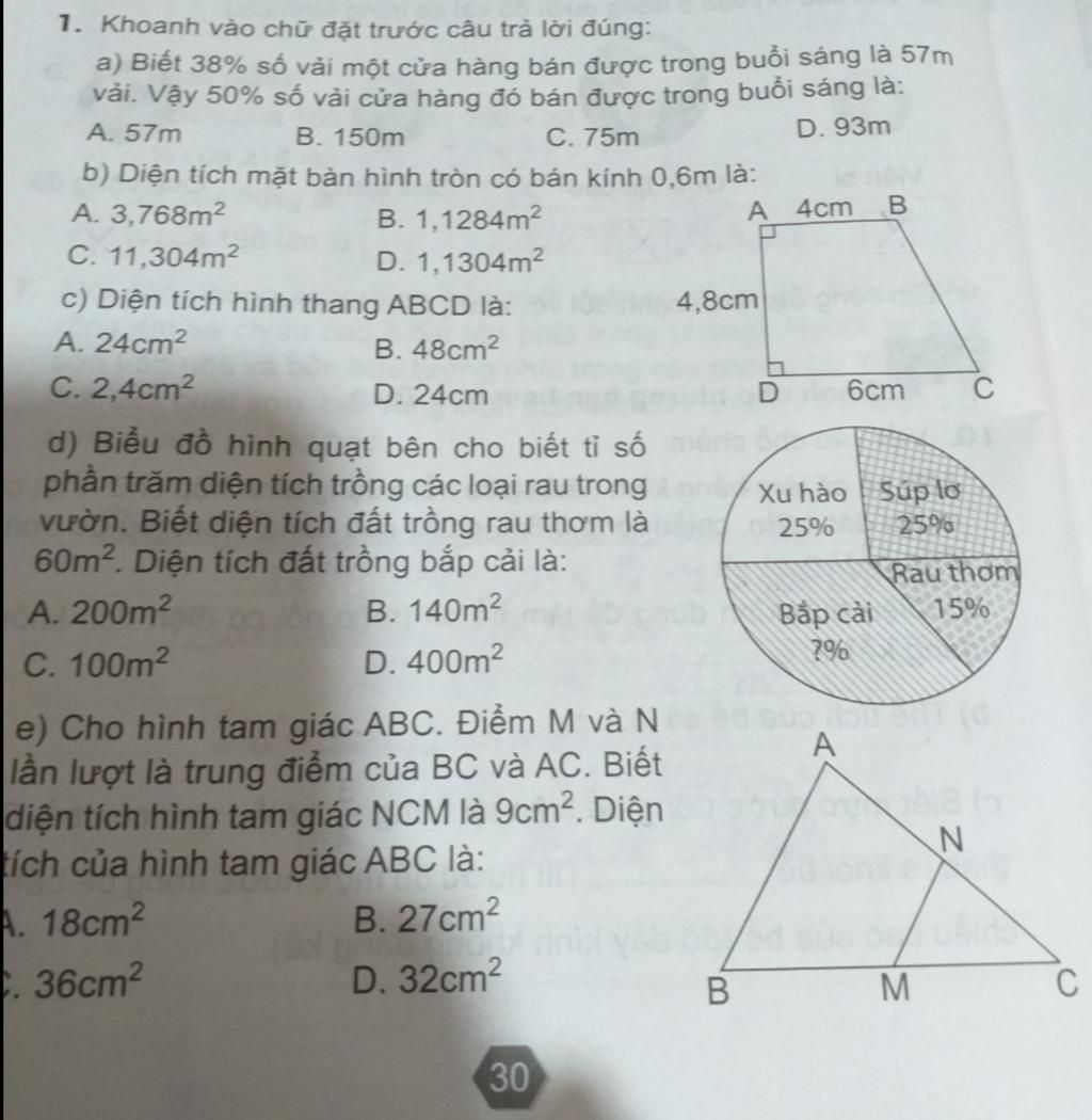 Ta có: C N A C = C M C B = 1 2 . Tỉ số diện tích tam giác CNM và ABC là `1/2` x `1/2` = `1/4` . 9 : `1/4` = 36 m².