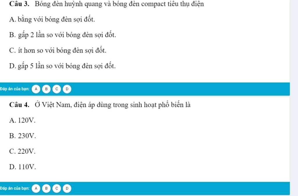 Câu 4. Ở Việt Nam, điện áp dùng trong sinh hoạt phổ biến là