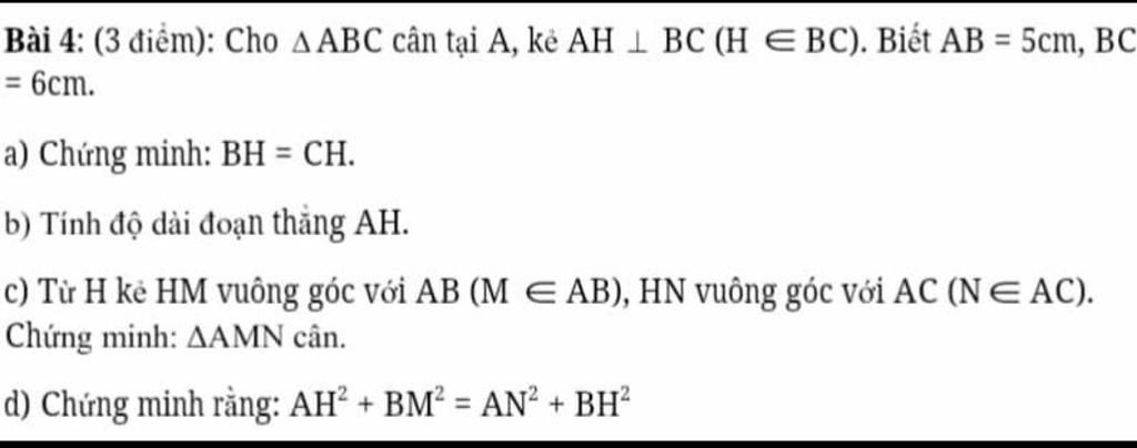 Bài 4: (3 điểm): Cho A ABC cân tại A, kẻ AH 1 BC (H E BC). Biết AB = 5cm, BC