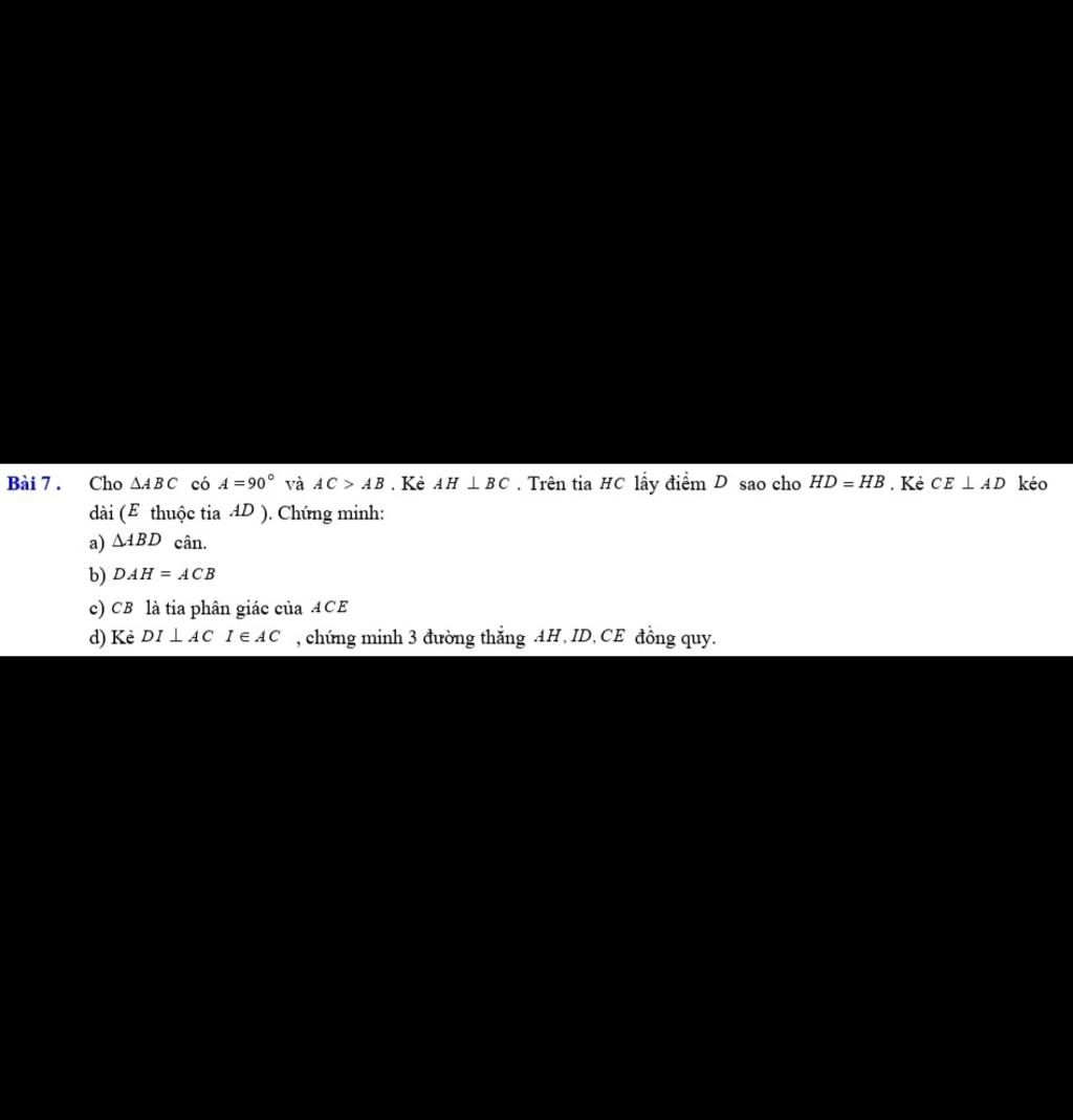 Cho A4BC có 4 =90° và 4C > AB. Kẻ AH I BC. Trên tia HC lấy điểm D sao cho HD = HB , Kẻ CE I AD kéo