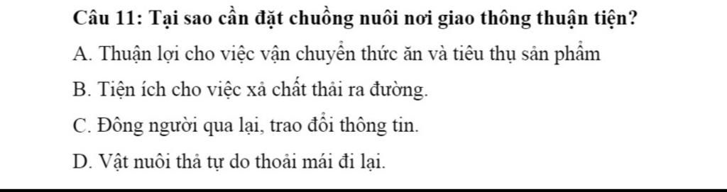 Câu 11: Tại sao cần đặt chuồng nuôi nơi giao thông thuận tiện?