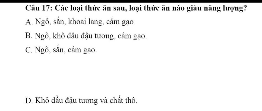 Câu $17:$ Các loại thức ăn sau$,$ loại thức ăn nào giàu năng lượng $? $