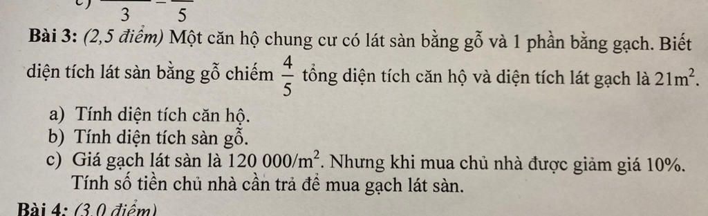 Bài 3: (2,5 điểm) Một căn hộ chung cư có lát sàn bằng gỗ và 1 phần bằng gạch. Biết