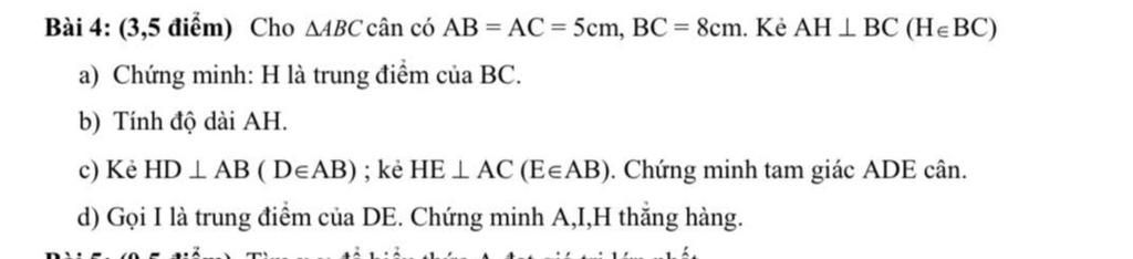 Bài 4: (3,5 điểm) Cho AABC cân có AB = AC = 5cm, BC = 8cm. Kẻ AH 1 BC (He BC)