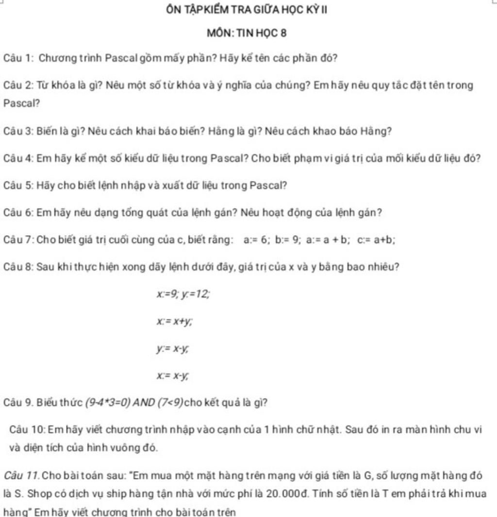 Câu 1: Chương trình Pascal gồm mấy phần? Hãy kế tên các phần đó?