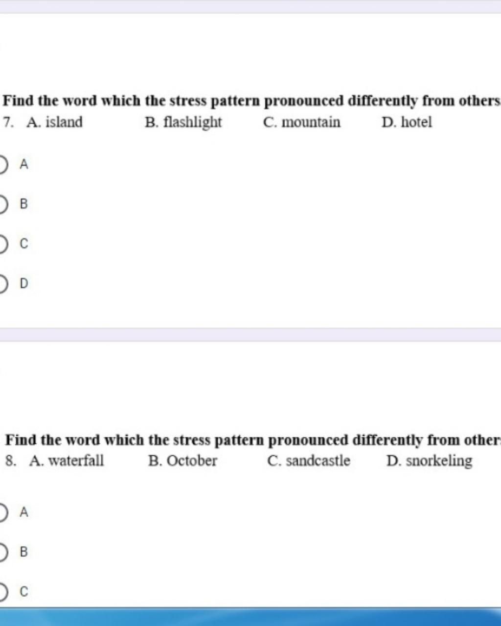 7.chọn d vì từ này nhấn trọng âm 2 còn lại nhấn trọng âm 1