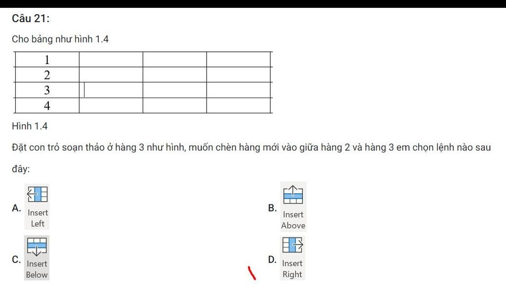 Đặt con trỏ soạn thảo ở hàng 3 như hình, muốn chèn hàng mới vào giữa hàng 2 và hàng 3 em chọn lệnh nào sau