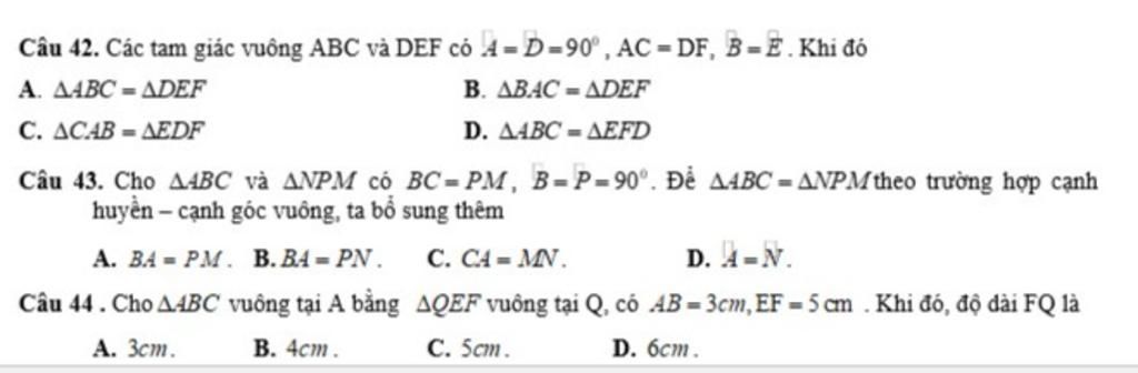 Câu 42. Các tam giác vuông ABC và DEF có 4 = D-90° , AC = DF, B=E.Khi đó
