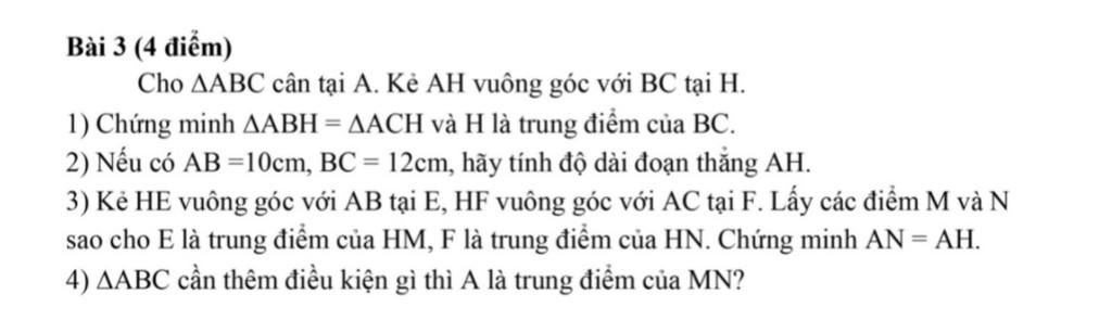 3) Kẻ HE vuông góc với AB tại E, HF vuông góc với AC tại F. Lấy các điểm M và N