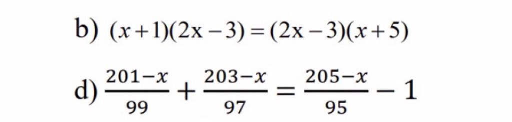 d)\dfrac{{201 - x}}{{99}} + \dfrac{{203 - x}}{{97}} = \dfrac{{205 - x}}{{95}} - 1\\