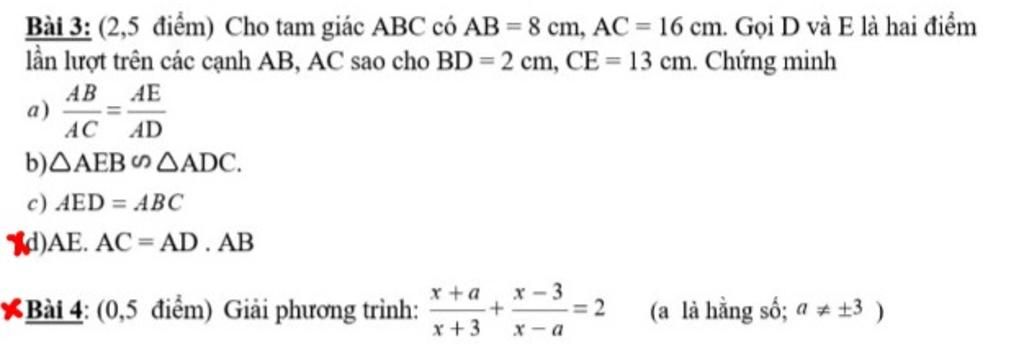 Bài 3: (2,5 điểm) Cho tam giác ABC có AB = 8 cm, AC = 16 cm. Gọi D và E là hai điểm
