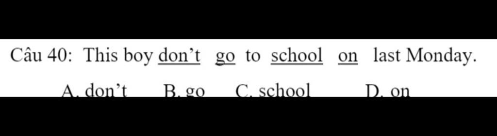 Trong câu có từ "last Monday" là dấu hiệu của thì quá khứ đơn nên trợ động từ phải là didn't/did not