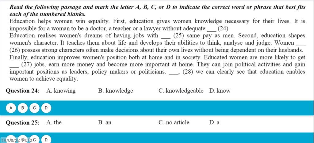 Read the following passage and mark the letter A, B, C, or D to indicate the correct word or phrase that best fits