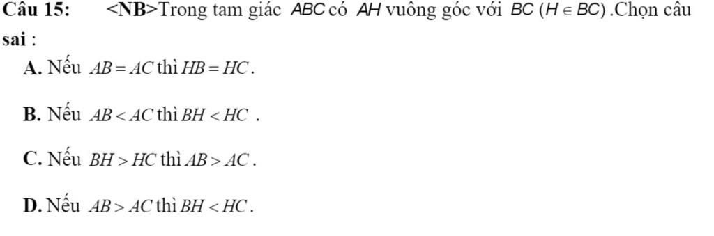 + Nếu $AB>AC$ thì $BH>HC \Rightarrow D$ sai.