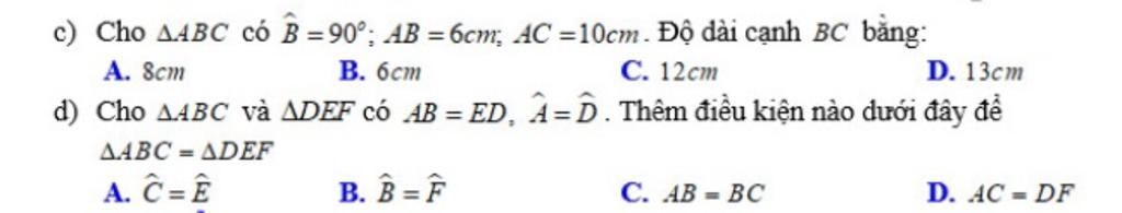 c) Do góc B bằng $90^o$ nên tam giác ABC vuôn tại B