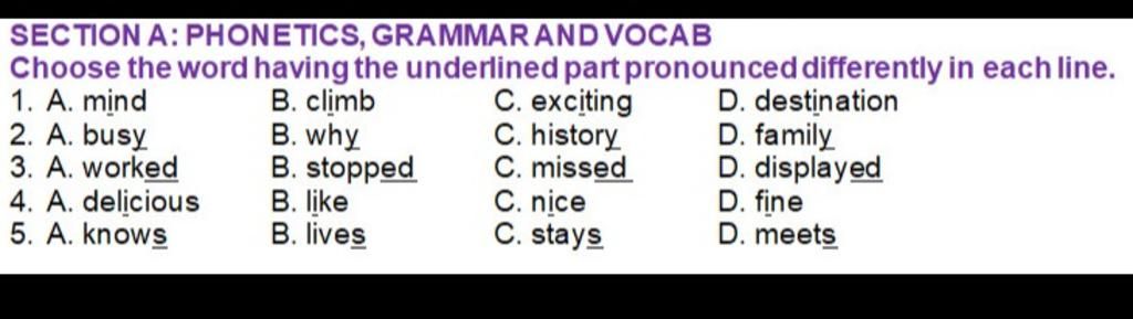 `1.D` (phát âm là /ɪ/, còn lại là /aɪ/)