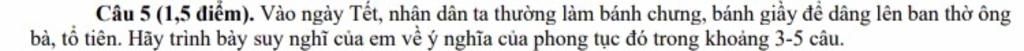 Bánh chưng, bánh giầy là hai loại bánh được tượng trưng cho trời và đất. Vì vậy khi ta cùng dâng lên bàn thờ ông bà tổ tiên với mâm ngũ quả như muốn tỏ lòng thành kính với những người đã khuất. Khi ăn bánh chưng, bánh giầy ta cảm nhận được vị ngọt, thơm, bùi của lúa, gạo, của cốm đọng lại trọng cổ họng chúng ta. Trong bánh chưng có thịt, có đỗ, có nếp, ngoài ra một số nhà còn cho hành vào tượng trưng cho mọi yếu tố quyết định sự thành công, thịnh vượng của họ trong năm mới. Còn bánh giầy có màu trắng, thường ăn với chả giò , có ý nghĩa là mong cho mọi việc làm được tròn trịa và đầy đủ.