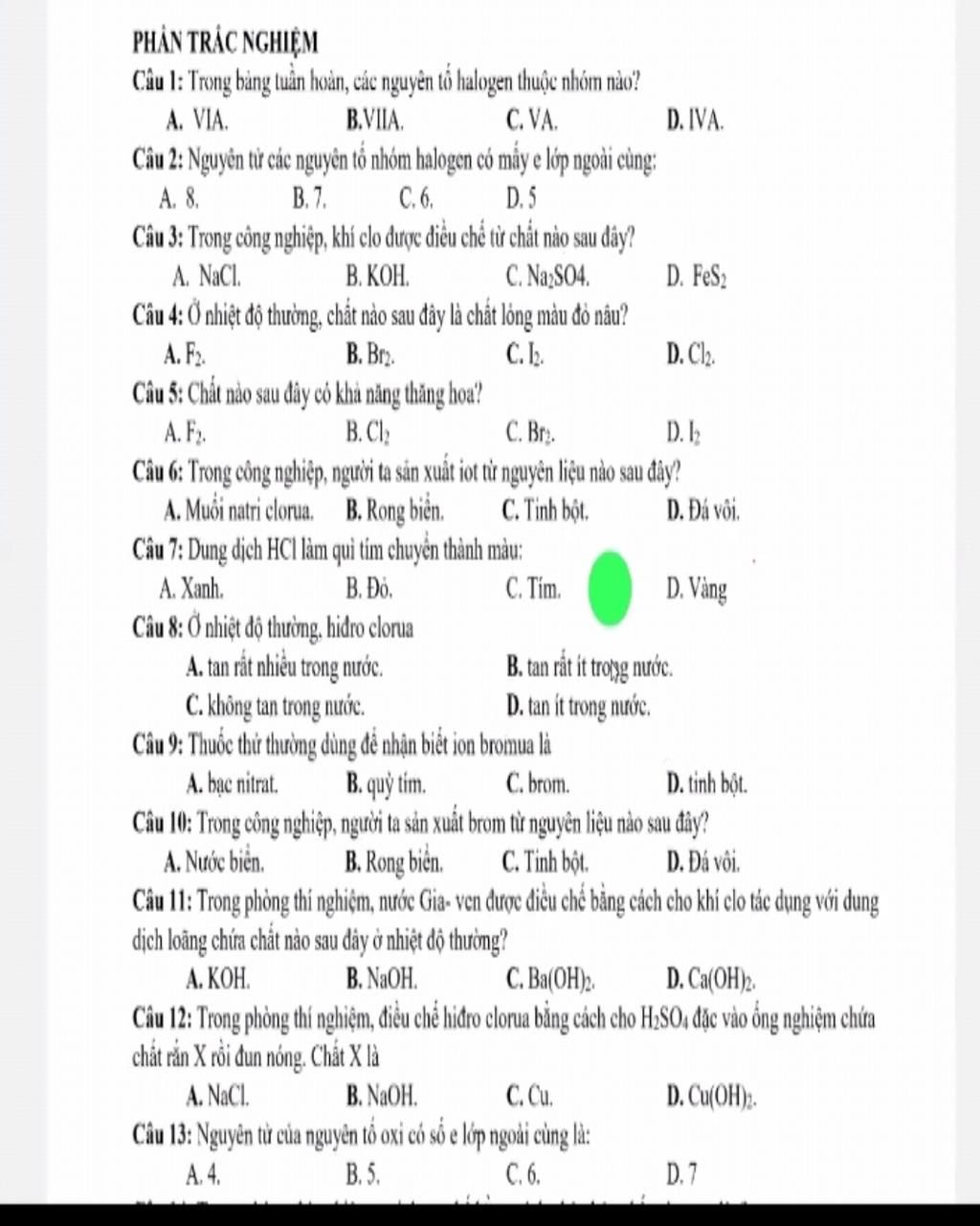Câu 1: Trong bảng tuần hoàn, các nguyên tổ halogen thuộc nhóm nào?