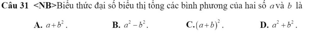 `->` Tổng các bình phương của a và b là: `a^2 +b^2`