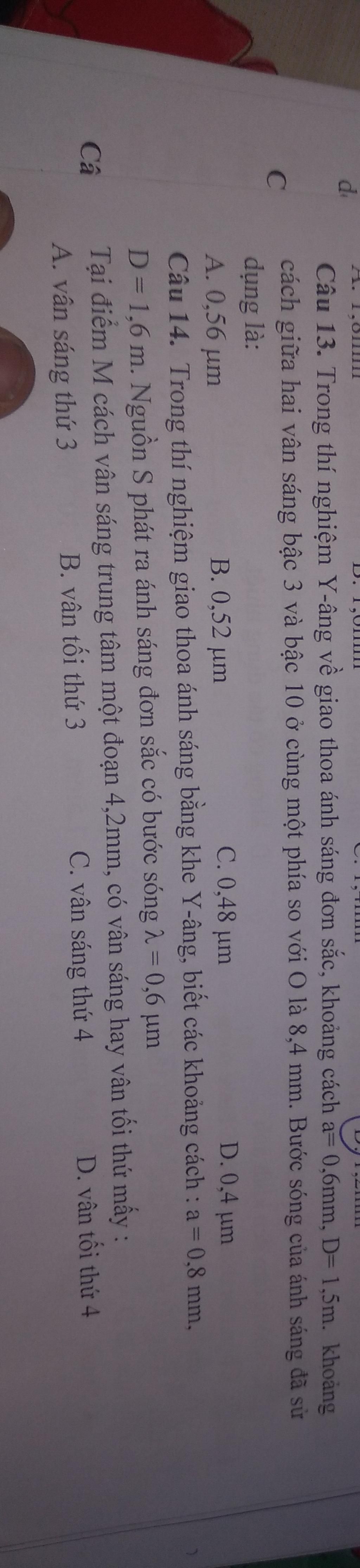\[i = \frac{{D\lambda }}{a} = \frac{{1,6.0,6}}{{0,8}} = 1,2mm\]