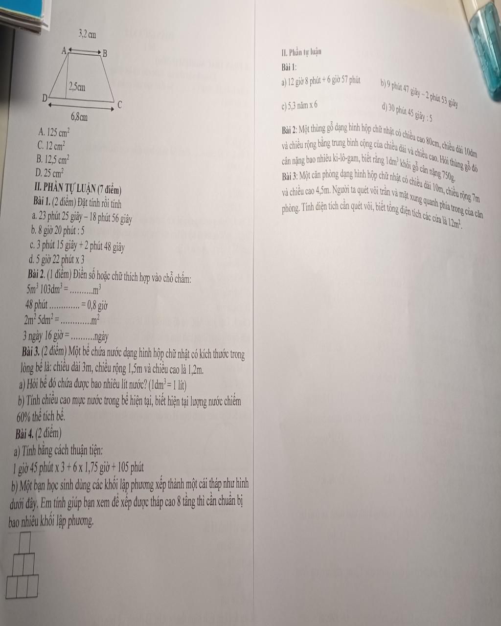 Bài 2: Một thùng gỗ dạng hình hộp chữ nhật có chiêu cao 80cm, chiều dài 10dm