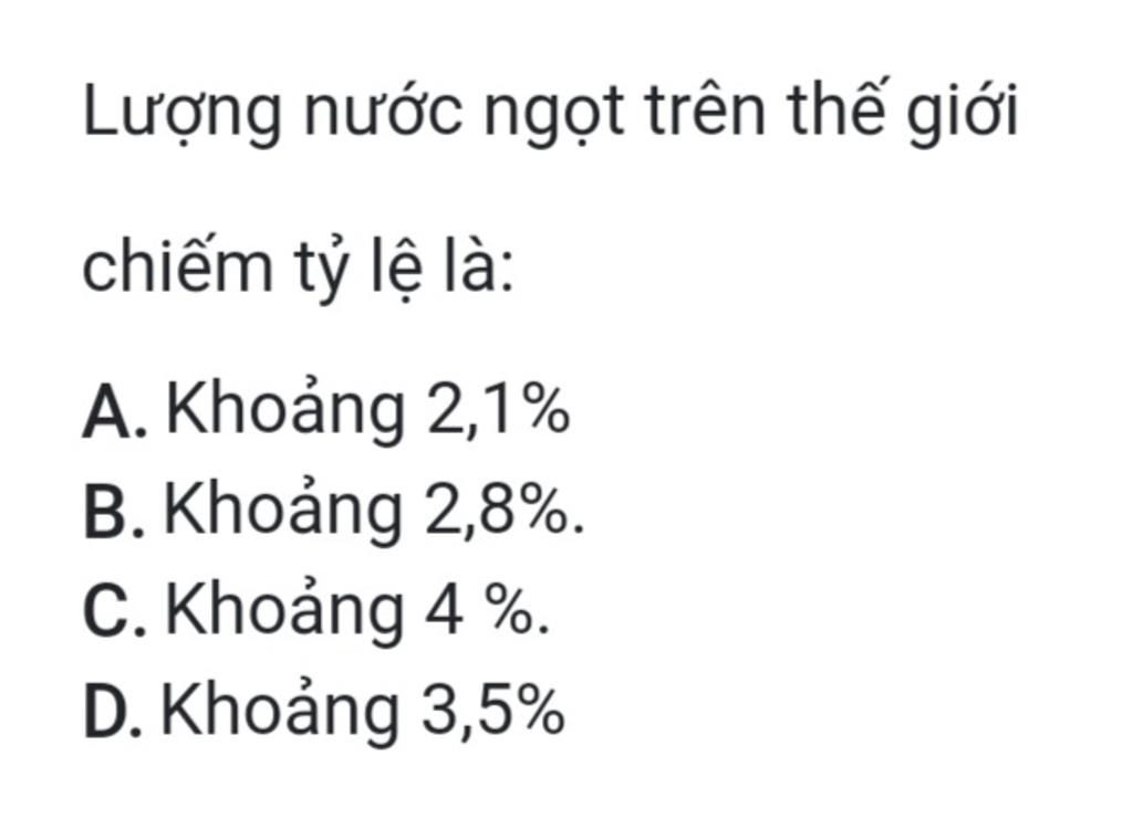 Lượng nước ngọt trên thế giới chiếm tỉ lệ khoảng 3,5 % , 97% nước trên thế giới là nước mặn .