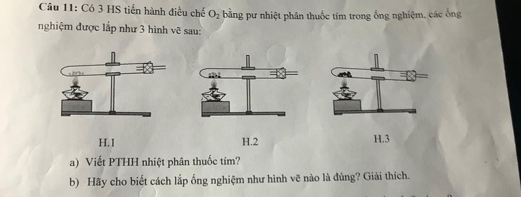b) cách lắp ống nghiệm như hình 3 đúng vì oxi nặng hơn không khí nên khi điều chế oxi phải để đáy ống cao hơn miệng ống như vậy khi bị tách ra khỏi `KMnO_4` oxi sẽ lắng xuống miệng ống nghiệm và truyền qua ống dẫn khí