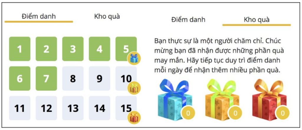 - Nếu không điểm danh liên tiếp sẽ bị trả lại điểm danh từ ngày đầu tiên (ví dụ em điểm danh ngày thứ 13 rồi, mà ngày thứ 14 em không điểm danh thì ngày 15 em vào sẽ phải điểm danh lại từ ngày thứ 1).
