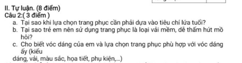 c)-Ví dụ: Dáng người gầy ,thì nên lựa chọn quần áo có dọc kẻ ngang ,ko nên chọn những bộ quần áo bó sát vào người vì thế sẽ làm bạn càng gầy đi.Nên lựa chọn quần áo sáng màu.