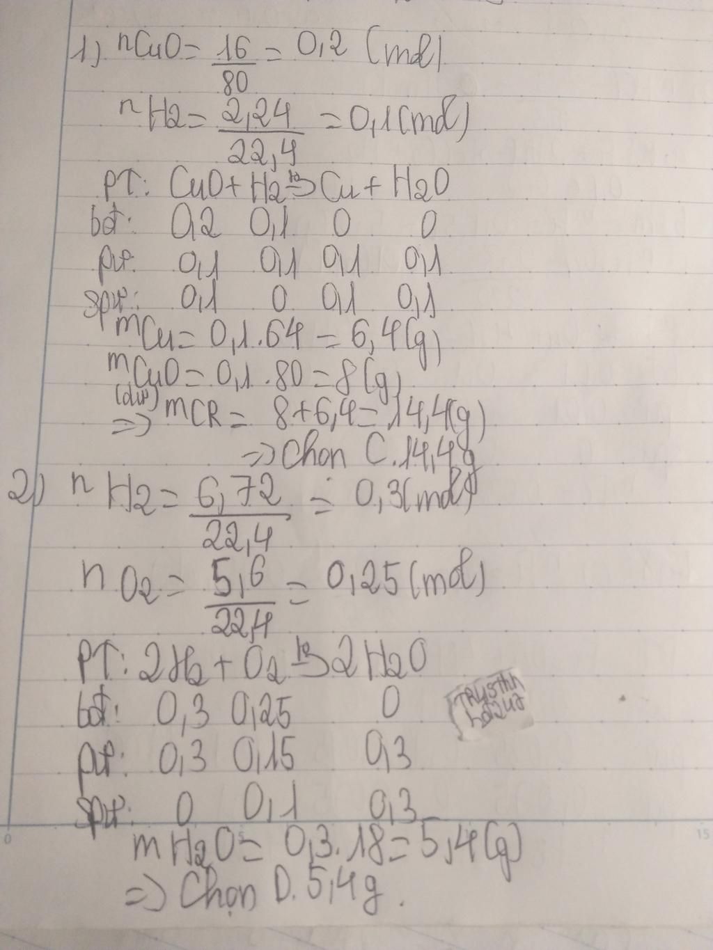 `PTHH : CuO +H_{2} → Cu + H_{2}O` `nCuO_{}= 16 : 80 = 0,2 (mol)` `nH_{2} = 2,24 : 22,4 = 0,1 (mol)` `→{nCu_{}}/{1} < {nH_{2}}/{1}` →Tính theo `nCu_{}` `→mCu_{}= 0,1.64 = 6,4 (gam) `