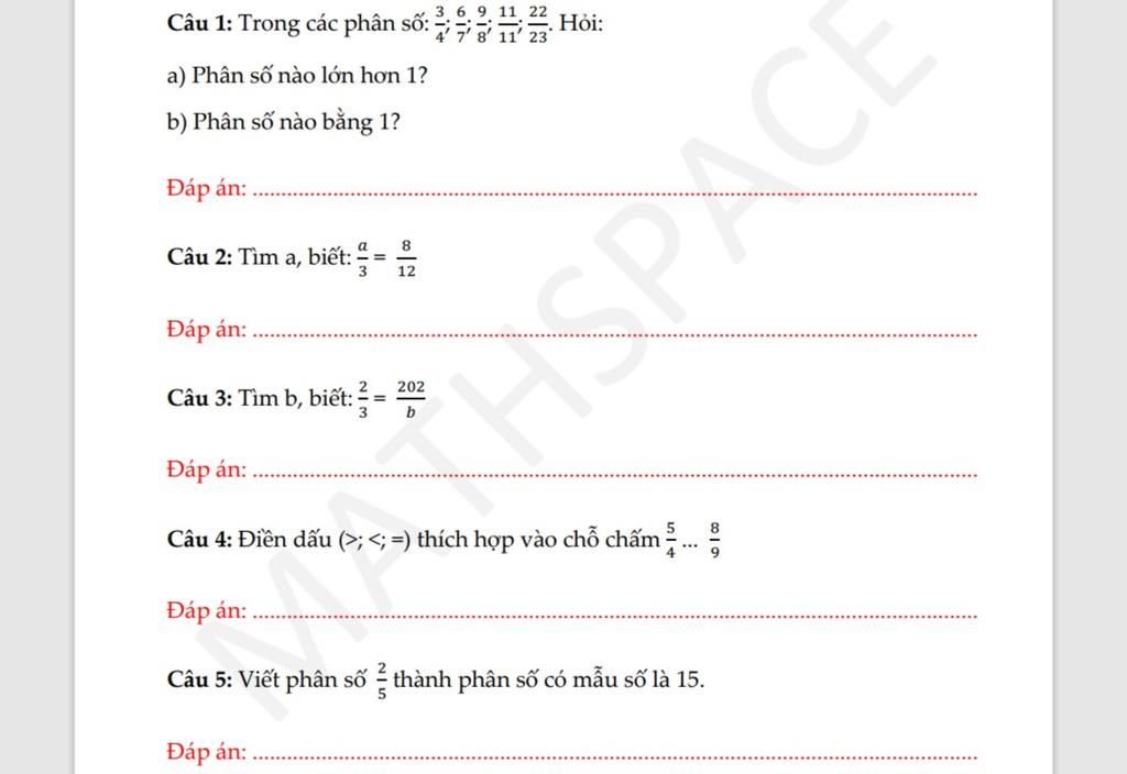 b) Phân số bằng `1` là phân số có tử bằng mẫu số